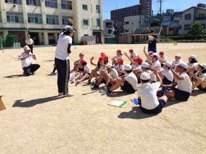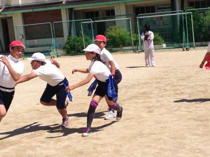 6月4日(木)5時限目に運動場で6年2組の体育科の授業研究会が行われました。単元は「フラッグフットボール」。子ども達が腰につけたフラッグをとられないようにしてボールを運んだりパスをしたりして得点を競うゲームです。アメリカンフットボールのこども版といった感じです。暑い中でしたが、子ども達は自分たちで考えた作戦を実行してうまくいくと歓声をあげていました。授業後の討議会では大阪教育大学の赤松先生から体育科の授業についてのアドバイスもいただきました。
