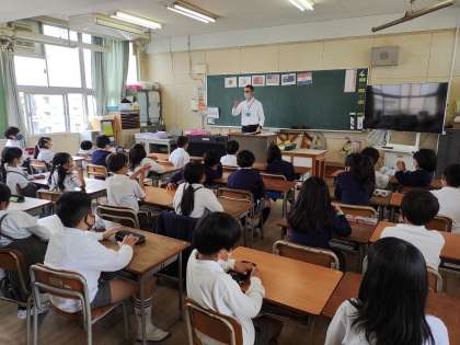 4月13日、この日初めて、3年生が英語の授業をC−NETの先生と一緒に勉強しました。緊張することなく元気に質問に答えることができていました。