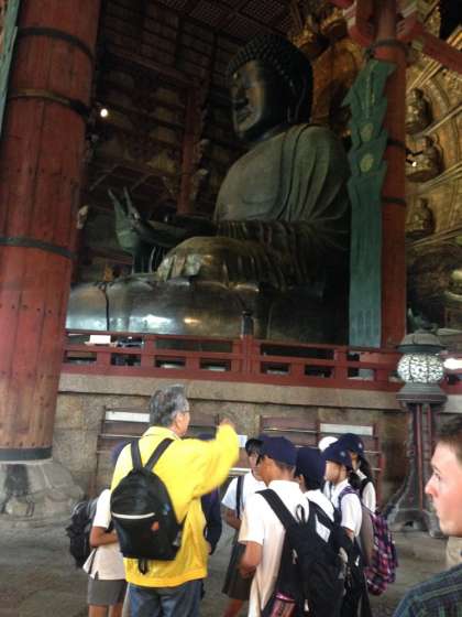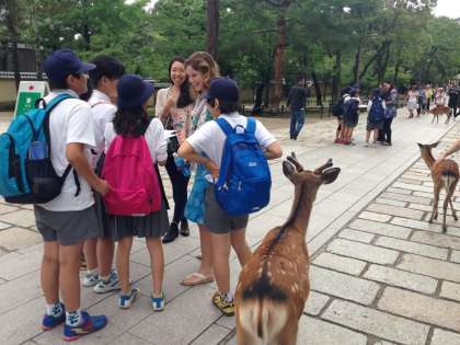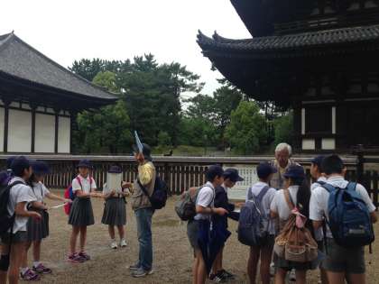 6月9日(火)6年生は、奈良公園方面へ社会見学に行きました。はじめにボランティアガイドさんの説明を聞きながらグループごとに興福寺から東大寺や二月堂などをめぐりました。奈良公園にはシカもたくさんいて子ども達は大喜びでした。春日野園地でお弁当を食べてから東大寺の参道で世界各地から来られている観光客の人に英語でインタビューもしました。あいにくの天気でしたが、子ども達にとっては、いにしえの都に思いをはせるとともに、世界の人々と交流できた楽しい一日となりました。