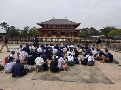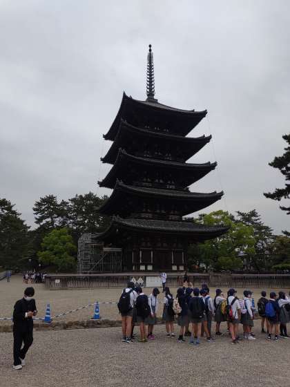 興福寺に着きました。中金堂の前で記念撮影。その後、学校に戻ります。