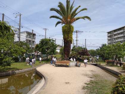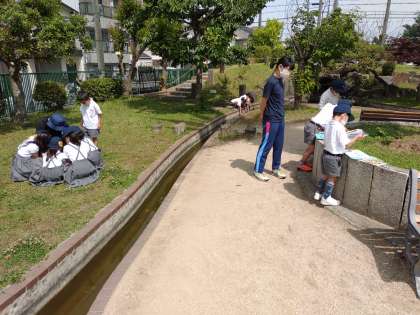 写真は1年生が遊びの広場で草花や虫の観察をしてスケッチしているところです。