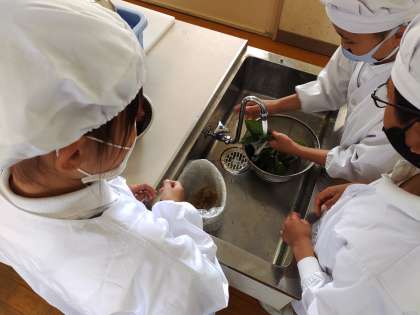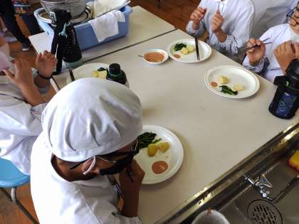 6月7日、5年生は調理実習を行いました。班ごとにほうれん草とじゃがいもをゆでて、みんなで調理しました。自分たちで作った料理の味はどうだったかな。