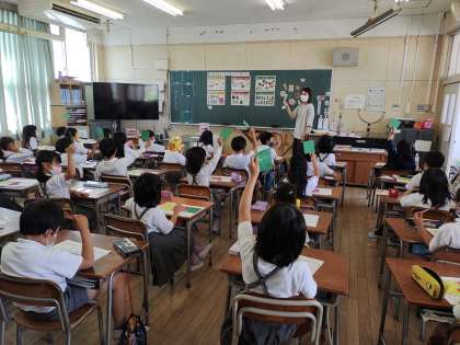 食物を「黄」(エネルギーのもとになる)「赤」(体をつくる)「緑」(体の調子を整える)の3つのグループに分けて、バランスよく食べることの大切さや、今日の給食の食材はどのグループに入るのかなどを学習しました。