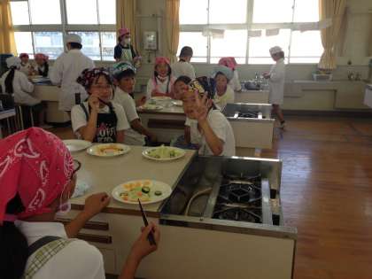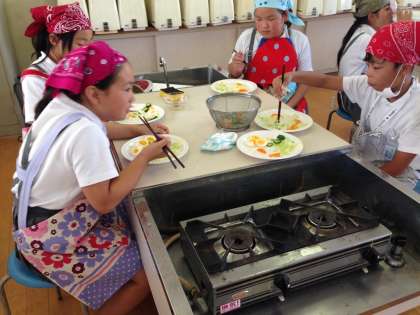6月29日(月)5年2組で調理実習を行いました。作ったのは「温野菜のサラダとゆでたまご」です。はじめての調理実習ということで包丁の持ち方や作り方の手順を確認して作業に取り掛かりました。今日は、ゆでることがメインの学習です。ガスコンロも上手に使ってグループで協力して楽しく実習をすることができました。簡単な料理ですが、おうちでも実践してほしいと思います。