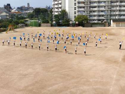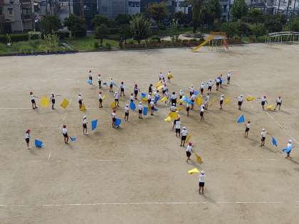 6年生の団体演技の練習の様子です。メロディーに合わせてフラッグがはためきます。隊形の変化もお楽しみください。