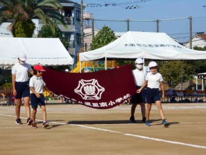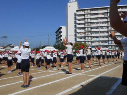 10月1日、晴天の中、第38回運動会を行いました。前日の準備には5・6年生が、そして今日の係活動には児童会や委員会が活躍してくれました。開会式・準備体操の写真です。