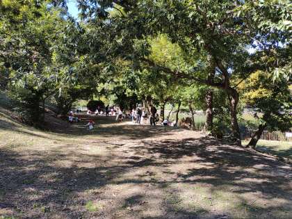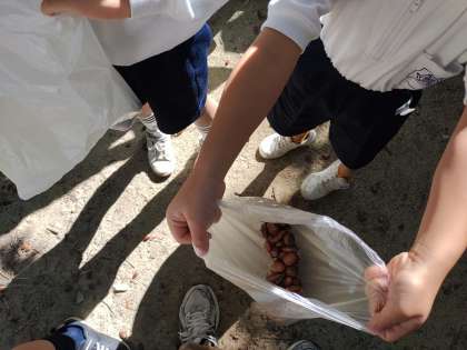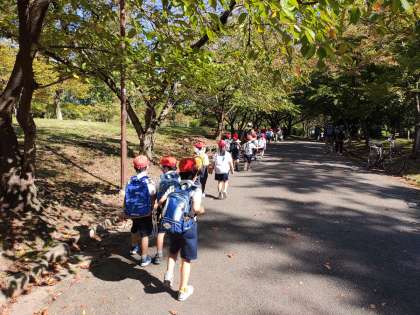 10月19日、今日は1年生の遠足です。上新庄駅までの徒歩や電車の中で、マナーをしっかり守れていました。公園に到着して、すぐにドングリ拾いです。