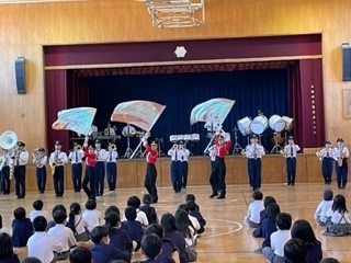 約1時間、子どもたちになじみの深い「ドラえもん」や「名探偵コナンのテーマ」などの演奏、東淀川署の防犯教室をはさんで、ドリル演奏を鑑賞しました。とても素晴らしい鑑賞会・防犯教室となりました。子どもたちも大きな拍手を送っていました。