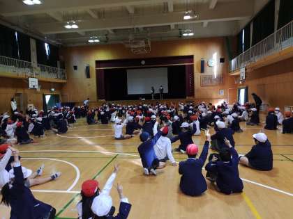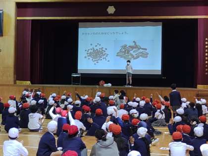 10月27日の児童集会で、美化栽培委員会が校内の美化と学習園の栽培による自然とのふれあいについて、クイズ形式で発表しました。清掃の仕方についての確認や植物の種についての舞台発表を通してみんなで学習しました。