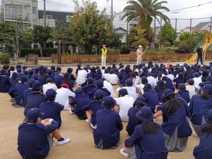2時間目は地震や津波の際の避難訓練を行いました。地震発生を想定して避難した後、運動場に集合し、防災についての話がありました。