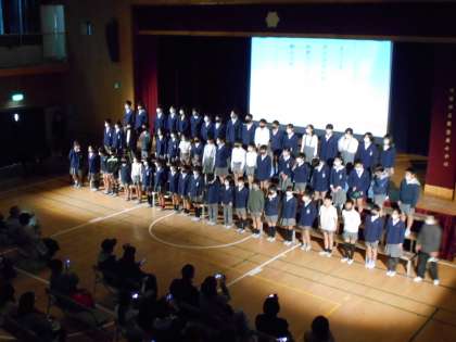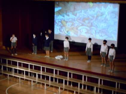 5年生は国語科で培ってきた物語分を読む力を生かして劇『世界で一番やかましい音』を発表し、その後合唱しました。