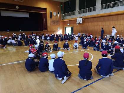 11月24日、児童集会でバクダンゲームをしました。班で丸く座りボールを回します。ドカーンと司会者が言ったとき、ボールを持っている人が負けというゲームでした。みんなで楽しくゲームができました。