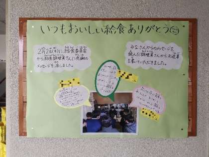 給食調理員さんに2月2日給食委員会の児童が全校児童の感謝のメッセージを渡しました。メッセージを読んだ給食調理員さんからお返事をいただきましたので、給食室前に掲示しています。