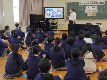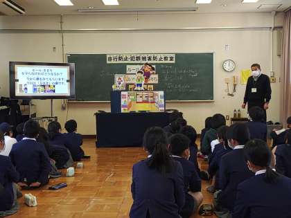 2月28日5年生は非行防止・犯罪被害防止教室を行いました。講師として梅田サポートセンターより2名の方に来ていただき、児童たちに万引きや喫煙の怖さなどについて講演と人形劇を通してお話がありました。最後にルールを守ることの大切さや思いやりの気持ちを持つこと、断る勇気を持つことなどを教えていただきました。5年生は45分間、しっかり話を聞くことができました。