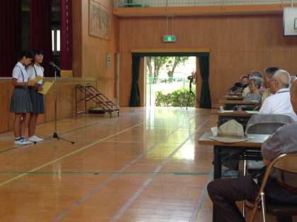 9月22日(日)第23回豊里南地域敬老大会が、盛大に行われました。70歳を越える方が200人以上集まり、地域をあげて長寿をお祝いしました。豊里南小学校からは、6年生の代表2名が参加し、お祝いの言葉を述べるとともに、記念品贈呈のお手伝いもしました。そして、5.6年生全員で書いたお手紙も渡しました。お年寄りの方は、その後、食事をしたり、バトントワラーや和太鼓演奏、民踊などの演芸を見たり、お楽しみ抽選会に参加したりして楽しい1日を過ごされました。これからも長生きされることを願っております。