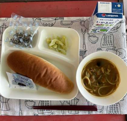 カレースープスパゲッティは、鶏肉、ベーコン、たまねぎ、にんじん、ピーマンがよく煮込まれていて、野菜が苦手な児童にも好評でした。