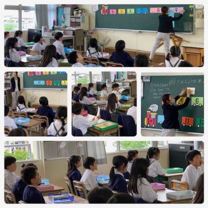 1年生は、初めての学習参観ですが、みんな元気に楽しく「たんじょうびれっしゃ」に乗せる自分の顔を描いていました。少し前に学習したパスを使っての「塗りこみ」をしっかりと覚えていましたね。