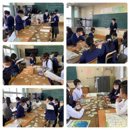 4年生は、社会科で都道府県の学習です。都道府県のカードをカルタの要領で取っていきます。手がかりは形です。なかなか難しいです。正直、大人でも負けてしまいそうですね。