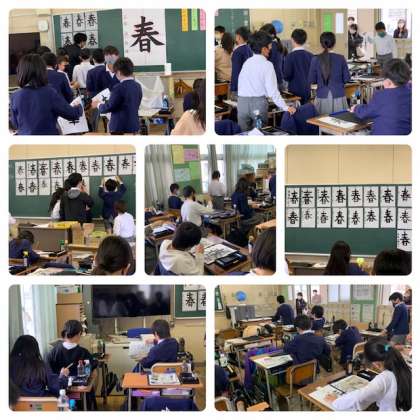 5年生は習字で「春」という字に挑戦です。始筆や終筆の場所を確認しながら慎重に書いています。特に、最後の名前を書く時にはものすごい集中力です。渾身の一作はできたかな?