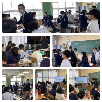 6年生は、社会科の学習です。1組は歴史というなかなか自分ごとになりにくいテーマを「もし縄文時代、自分なら何食べる?」という切り口で、課題へのイメージをうまく方向付けしています。2組は、まだ新年度の学習が始まって間もないのに、縄文時代について課題別に調べたことをプレゼンにまとめて発表しています。さすが!6年生。
