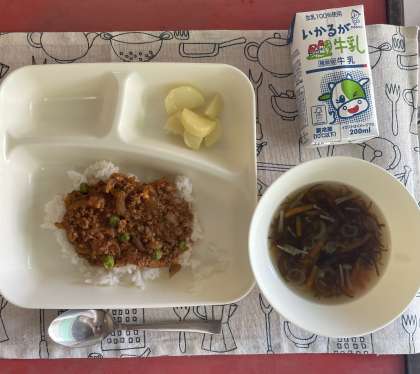 給食では、牛ひき肉、豚ひき肉、たまねぎなどをいためて味付けし、ごはんにかけて食べます。