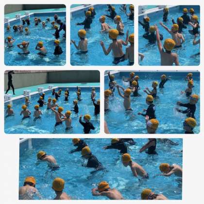 シャワーから出ると水を減らしたプールに入水です。はじめは少しこわがっていた子もいましたが、入ってしまえば、楽しく音楽に合わせてエビカニクスです。エビになるところでは、しっかりと水に顔をつけている子がたくさんいて感心しました。