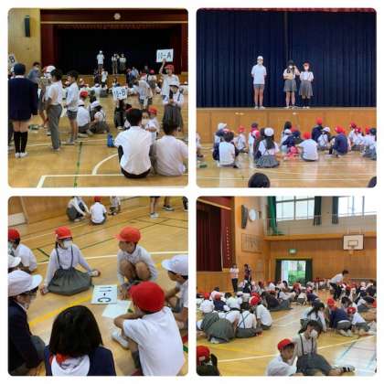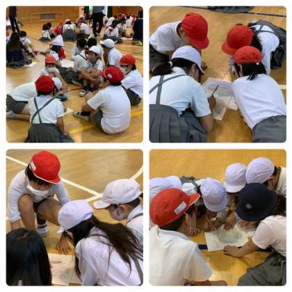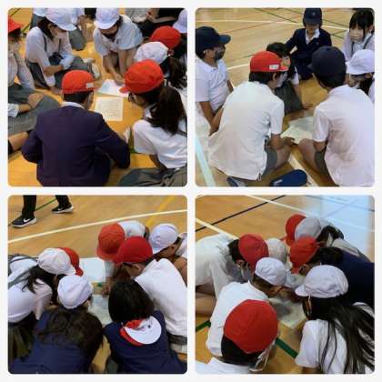 今日の児童集会は、たてわり班でミナクルパーティーに向けての話し合いです。メンバーの確認や名前の記入のあと、本番のお店回りの順番決めです。どのお店から回ろうか、どんな順番がいいかといった話し合いになった途端、顔を寄せ合い真剣な眼差しで話す子どもたちです。