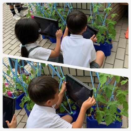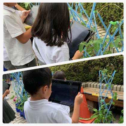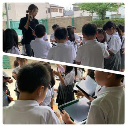今月から一年生も一人一台端末を使い始めています。少し前に担任の先生といっしょにICTアシスタントさんにも教えてもらって、もうログインはお手のものです。今日はカメラ機能を使って、アサガオの観察をして、デジタル上で先生に提出です。できることがどんどん増えていく一年生です。