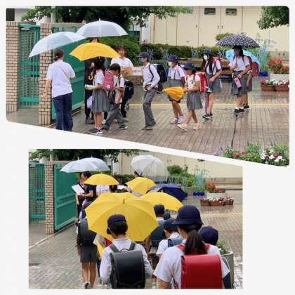 その後、大雨から身を守るためには早めに避難すること、どこへ逃げたらいいのか、どんなことに気をつけて避難すればいいのか放送で講話をしました。その後、分団で危険な箇所や、夏休みに気をつけることなどを話し合ってから、集団下校しました。