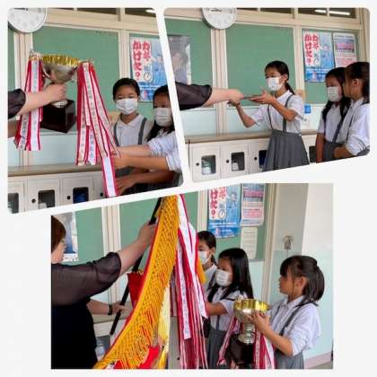 今日の児童朝会では、豊里南地域子ども会のソフトボールとキックベースの両チームの表彰を同時に行いました。