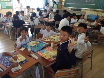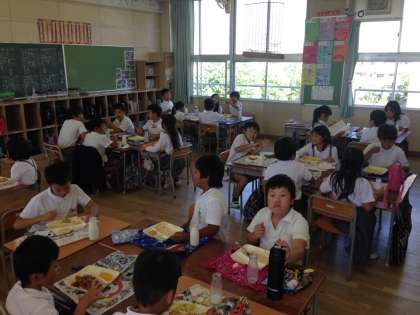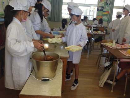 10月7日(水)異学年交流の一環として、交流給食を実施しました。1年生と6年生、2年生と5年生、3年生と4年生という組み合わせで、教室にいる子ども達が半分ずつ入れ替わって給食を食べました。今日のメニューは、ハヤシライス、野菜サラダ、黄桃、牛乳でした。今年度2回目ということもあって、どの学級もおしゃべりをしながら楽しそうに給食を食べていました。