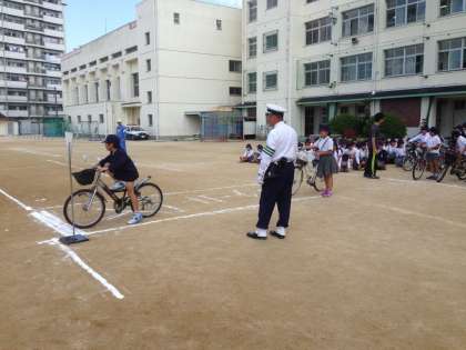 10月8日(木)交通安全指導を行いました。東淀川警察の方と区役所の方に来ていただいて、1年生から3年生は「安全な歩行について」、4年生から6年生は「自転車に関する交通ルールついて」教えていただきました。最近、全国的に自転車での事故で被害者から多額の賠償請求をされるケースも多く発生しています。子ども達には、これからも地域で交通ルールをしっかり守って、安全に過ごしてほしいと思っています。