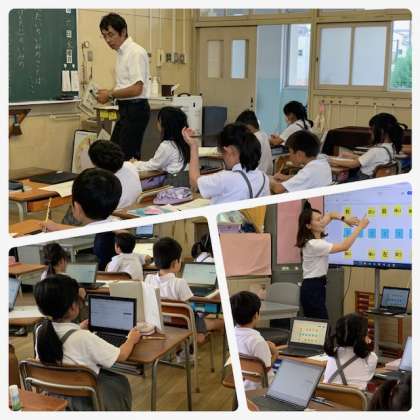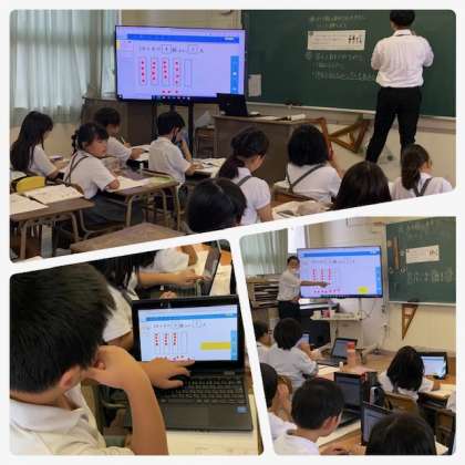 三年生は、習熟度別で算数の学習です。端末を使って割り算の計算の仕方について考えています。何個ずつかなぁ、ドット図を操作して考えます。