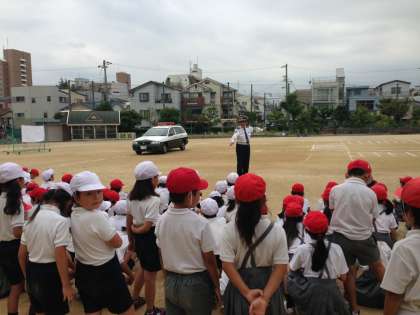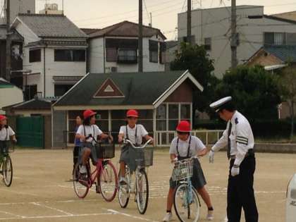 10月3日(木)2.3時間目に東淀川警察署の警察官2名と区役所の安全防犯担当の方2名に来ていただいて、交通安全指導を行いました。1年〜3年生は、道路の歩き方や横断歩道の渡り方を、4年生〜6年生は安全な自転車の乗り方について教えていただきました。登下校はもちろんですが、おうちに帰ってからの交通安全にも気をつけてほしいものです。