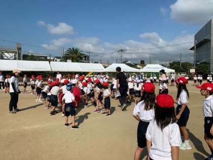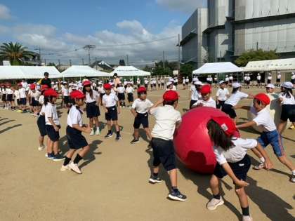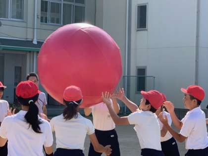 最後の全体練習では全校競技「大玉運び」の練習をしました。一年生から六年生までがいっしょに力を合わせて大玉を運びます。