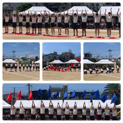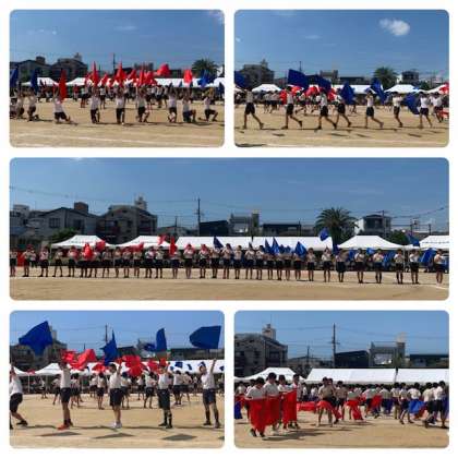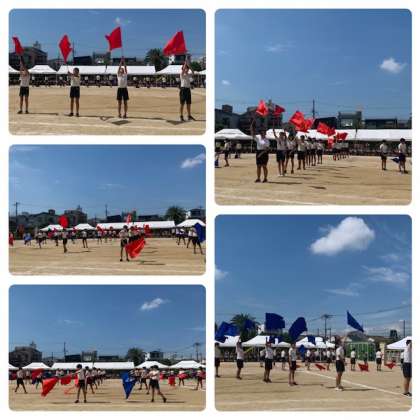 六年生の振り抜くフラッグの音が秋の澄み切った空に響き渡ります。真剣な眼差しと引き締まったその表情は最高学年にふさわしい演技です。感動しました。