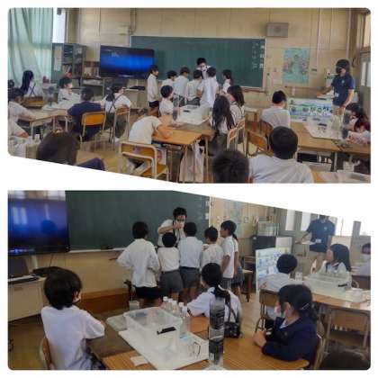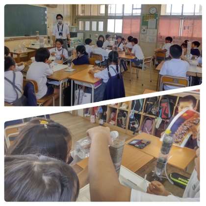 今日は、柴島浄水場で働いておられる方に学校へ来ていただき、四年生が浄水場の仕組みについて学習しました。