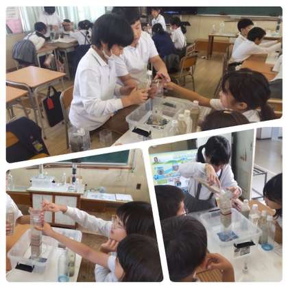 ろ過装置を使って班で実験をしながら、ろ過の仕組みについて学びました。
