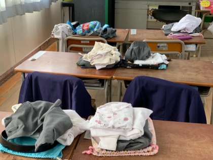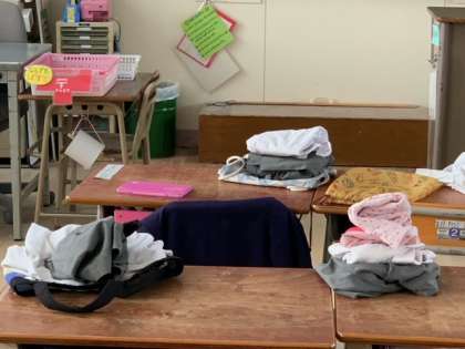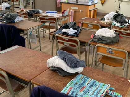 ずいぶん静かだなぁと思ったら、体育の時間のようです。机の上には、きちんと畳んで重ねられた標準服がたくさん置かれています。自分の身の回りのことがきちんとできていて、うれしく思います。お家でもできているかな?
