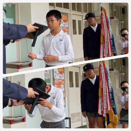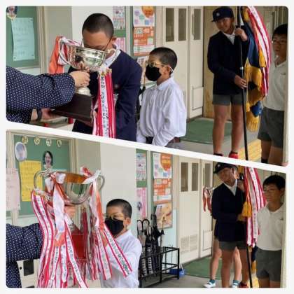 今週の児童朝会で豊里南子ども会ソフトボールチームの表彰を行いました。