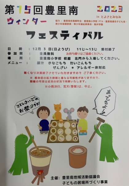 12月3日、日曜日に豊里南小学校の校庭で、第15回豊里南ウィンターフェスティバルが開催されます。