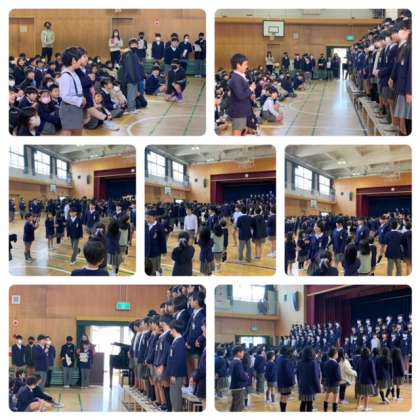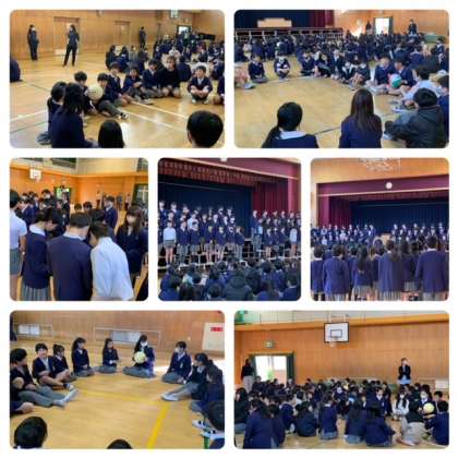 今朝の児童集会は、全校で6年生を送る会をしました。4年生と5年生の代表委員の進行で、たてわり班でジャンケン列車やバクダンゲームをした後、班の6年生に一人一人メッセージカードを手渡しました。