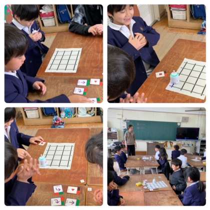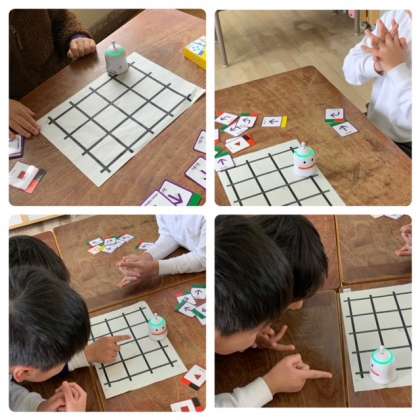 一年生からプログラミングの学習をしています。最初はパソコンは使わずに、小さなロボットをコマンドが書かれたカードを使って動かします。スタートからゴールまでロボットを動かすには、どのカードをどの順序で食べさせたらいいかな。みんなで考えて取り組んでいます。
