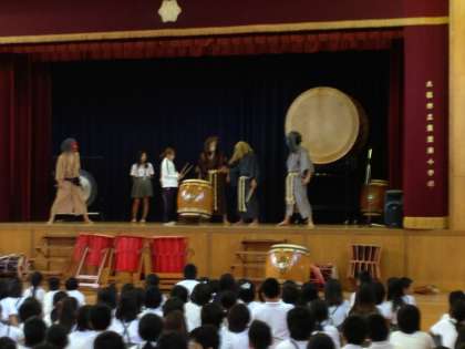 10月7日(月)3、4時間目に芸術鑑賞会を講堂で行いました。今回は、「倭太鼓 飛龍」に来ていただき、全学年一緒に迫力ある太鼓の演奏を鑑賞をしました。太鼓の演奏だけでなく、太鼓の名前を教えてもらったり、たたかせてもらったりして、とても楽しい時間を過ごすことができました。