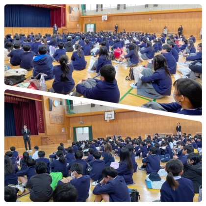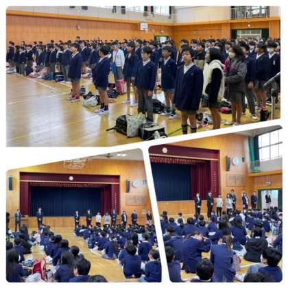 体育館で新しく来られた先生方の着任式をした後に続けて始業式を行いました。