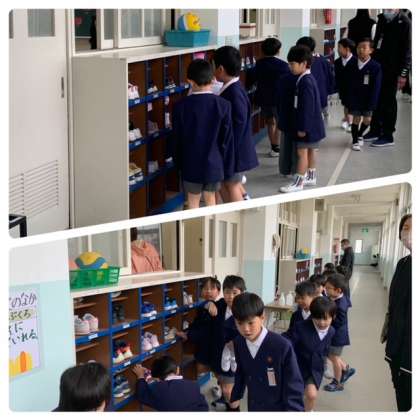 今日から一年生も本格的な学校生活の始まりです。少し緊張した面持ちでしたが、先生のお話をよく聞きながら、靴箱の使い方や座る時の姿勢、お手紙の回し方など、いろんなことを少しずつ学んでいきます。