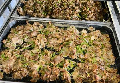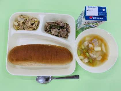 ガーリック焼きは、塩、こしょう、ガーリック、こいくちしょうゆ、オリーブ油で下味をつけて、ピーマンとともに焼いています。給食では、週に3回がごはん、2回がパンです。今日は1年生にとって初めてのパンでした。