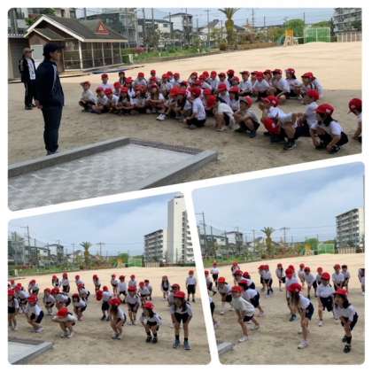 一年生2クラスが体育の授業をがんばっています。まずは、2列に並ぶところからです。