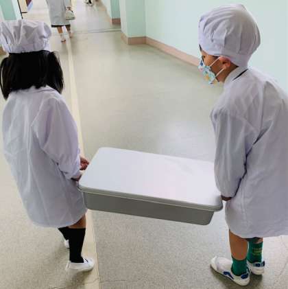 1年生の給食は、今までは6年生のお兄さん、お姉さんが運んでくれていたのですが、今日から給食当番が、自分たちで給食を運びました。