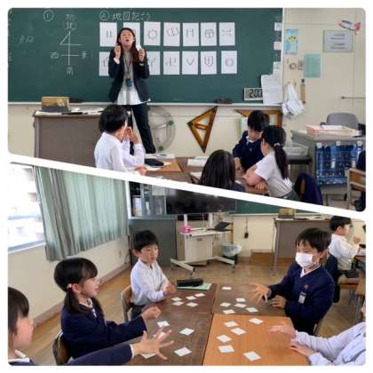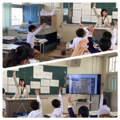 二組は、大阪市にある24区を地図から探す学習です。一つ一つ丸印で囲みながら確認しています。みんなすぐに見つけて、どんどんと手が挙がっていますね。
